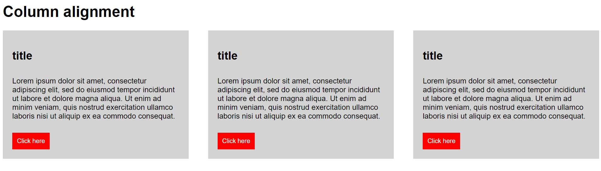 A common layout issue that I notice happens frequently when building web pages is the multi column ‘card’ style layout that would typically have some content inside each tab with a call to action button at the bottom. A typical example is shown in the image below. (For this example I have used Flexbox to build out the basic layout of the columns.)