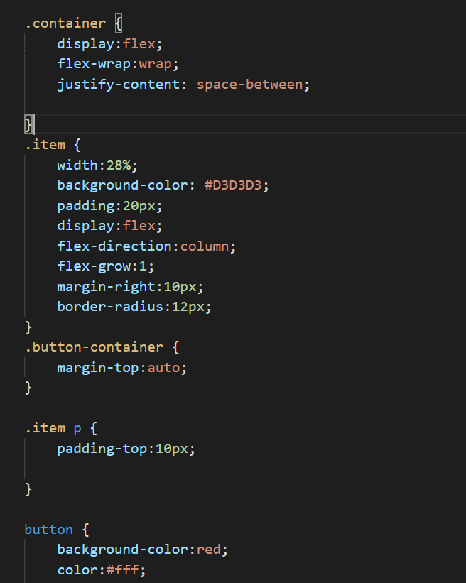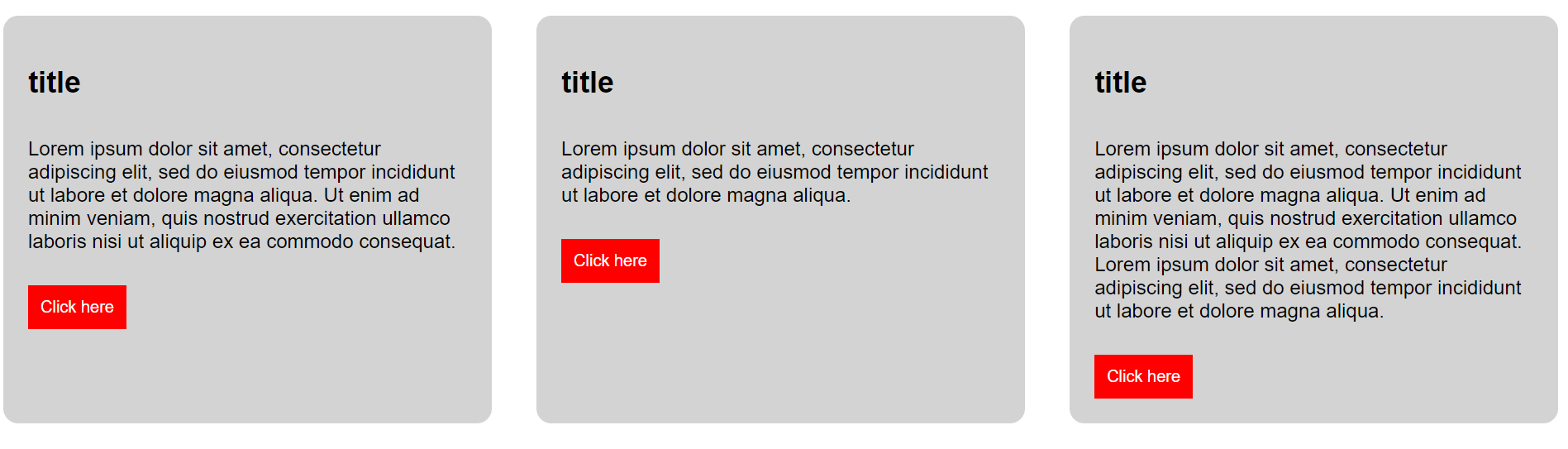 I have previously set the container of the three cards to flex in order to get them to display side by side in columns and now we are also going to set each of the cards to display: flex as well. In addition to this we will also set flex-direction: column on each item. The button is then wrapped in it’s own DIV container and the margin-top set to auto. Once this is implemented the layout should look like this;